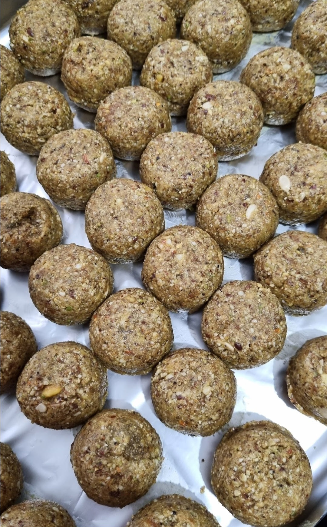 Panjeeri Ludoo features a powerhouse mix of nuts like almonds and pistachios to provide protein and healthy fats. Dried fruits add antioxidants and natural sugars for quick energy. Spices like cardamom and saffron provide rich flavour as well as anti-inflammatory benefits. Chironji and poppy seeds supply a mineral boost. All combined in a sweet date and jaggery binding syrup.